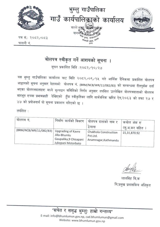 बोलपत्र स्वीकृत गर्ने आशयको सूचना