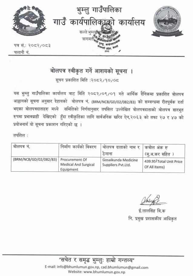 » बोलपत्र स्वीकृत गर्ने आशय सम्बन्धी सूचना