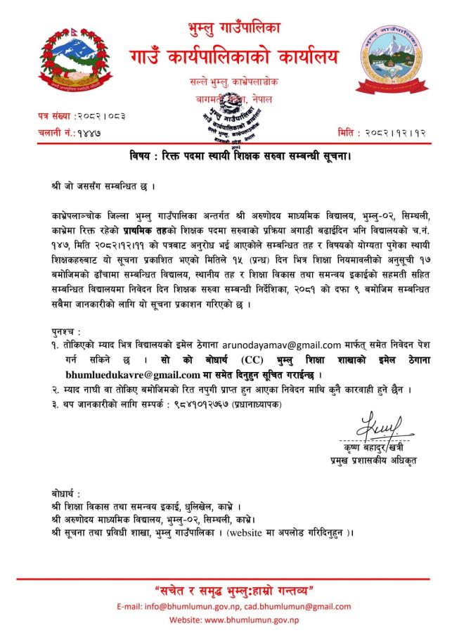 सेवा करारमा शिक्षक पदपूर्ति गर्ने सम्बन्धी सूचना