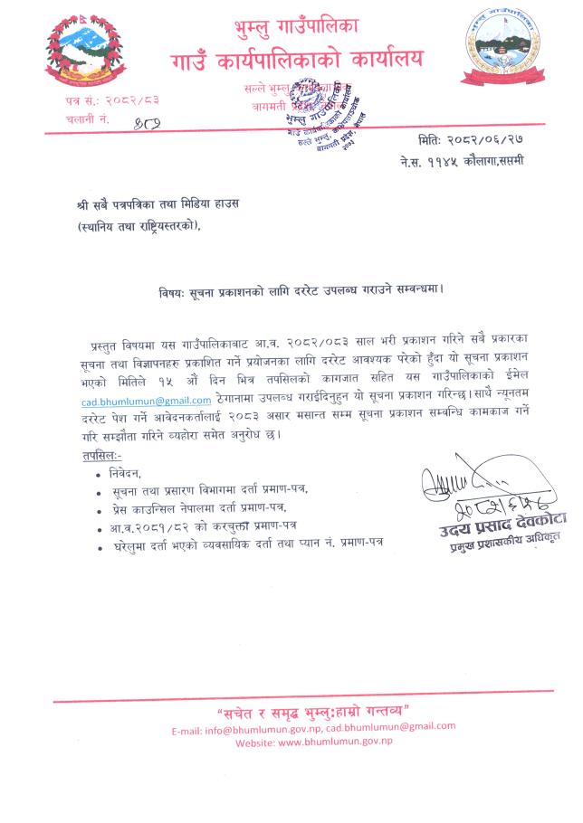 सूचना प्रकाशनका लागि दररेट उपलब्ध गराउने सम्बन्धमा ।