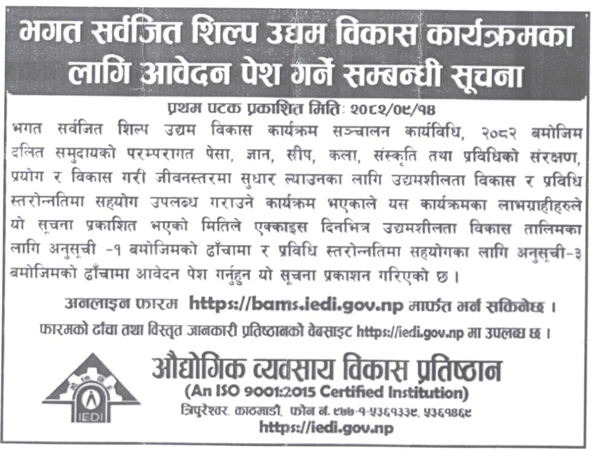 औद्योगिक व्यवसाय विकास प्रतिष्ठानको भगत सर्वजित शिल्प उद्यम विकास कार्यक्रमका लागि आवेदन पेश गर्ने सम्बन्धी सूचना ।