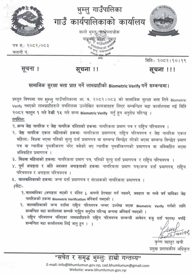सामाजिक सुरक्षा भत्ता प्राप्त गर्ने लाभग्राहीको Biometric Verify गर्ने सम्बन्धमा ।